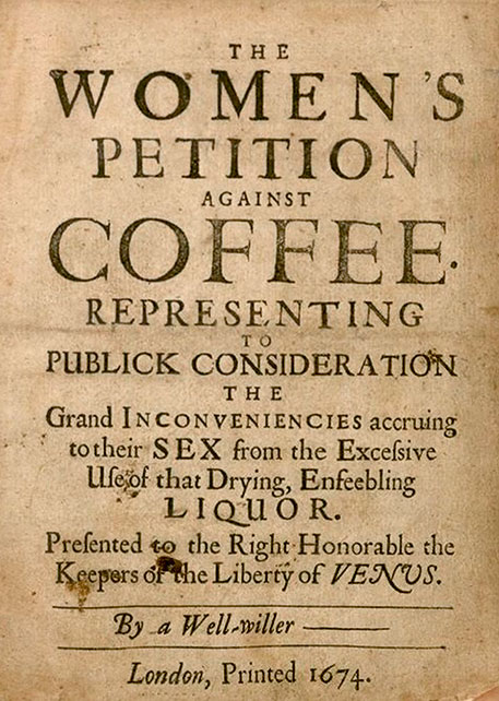«Женская петиция против кофе» была сатирической, но она очень точно отражает отношение общества к тому, как «обычная черная, густая, грязная, горькая, вонючая, тошнотворная вода из лужи» влияет на сексуальную потенцию. «Жены» винили кофе в том, что этот напиток «сушит «важную влагу» их мужей, делая их «бессильными, словно старики, и бесплодными, как те пустыни, откуда была привезена эта проклятая ягода». Мужчины лишаются жизненных соков, и «из них не выходит ничего влажного, кроме сопливых носов, и ничего не стои́т, кроме суставов, и не торчит, кроме ушей».