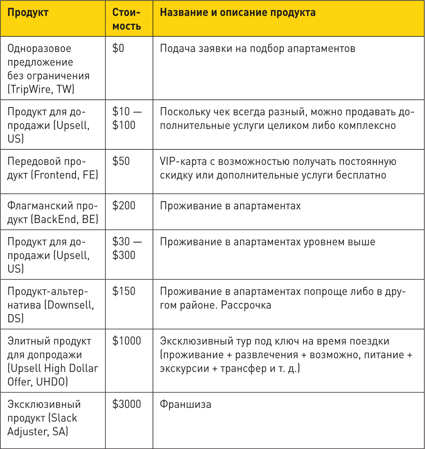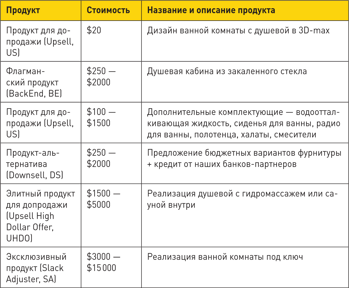 Что касается флагманского продукта – BackEnd, BE – самого дорогого в линейке. Это может быть баня, дом, квартира, это может быть дорогой тренинг, это может быть какая-то услуга и т. д. То есть это то, ради чего вы строите автоворонку. Потому что ее цель – продать самый главный и самый дорогой продукт BE. Принципы его построения и декомпозиции уже разобраны, поэтому перейдем к продукту-альтернативе (Downsell, DS).