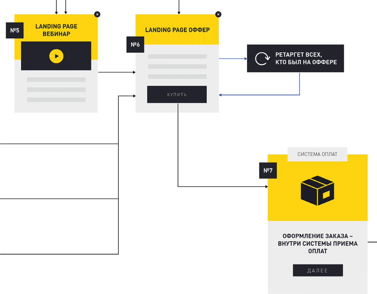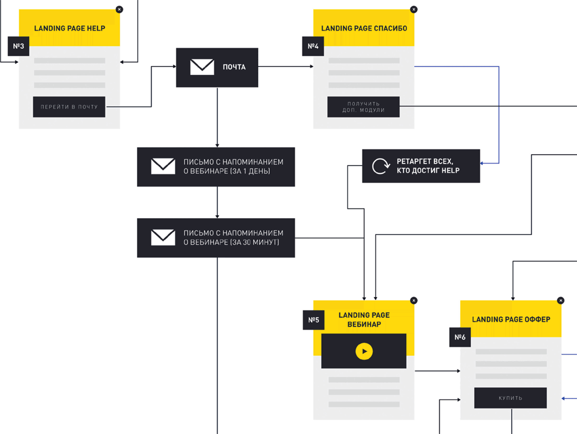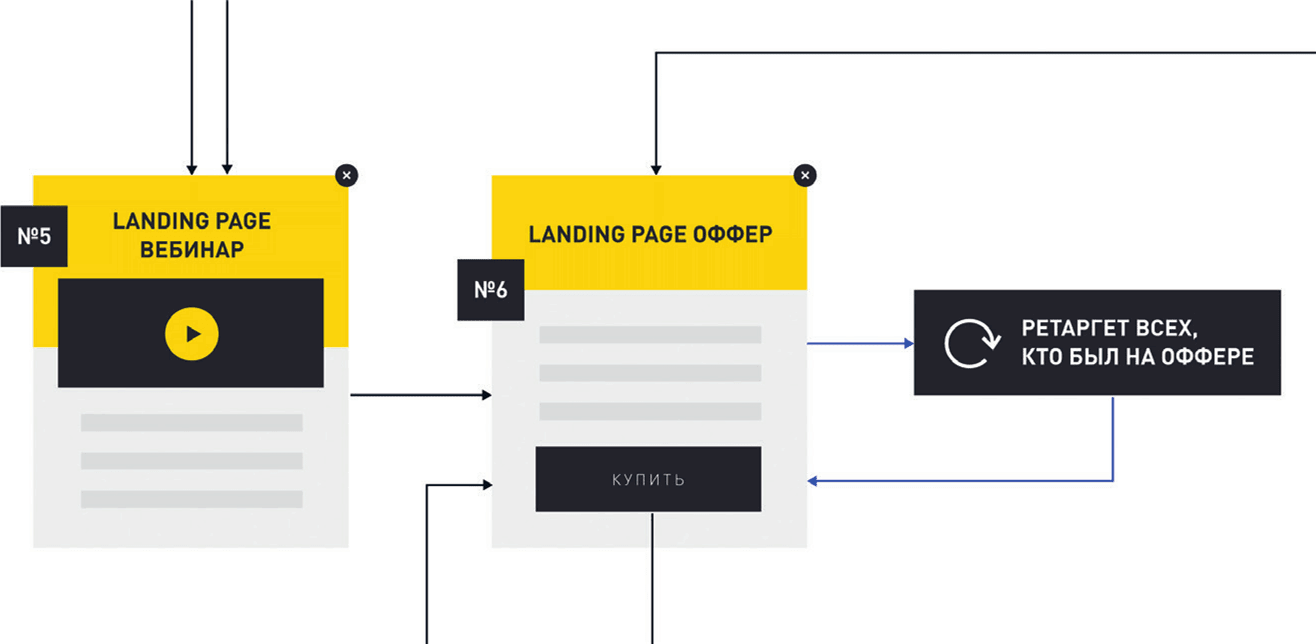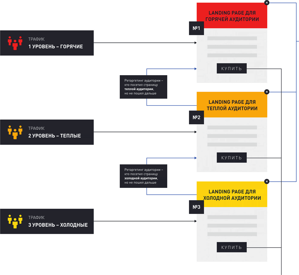 Кроме того, если человек изучил лендинг (например, для холодного трафика), мы догоняем его ретаргетингом и показываем страницу, предназначенную для теплой аудитории, постепенно обучая покупать именно у вас. Тот же принцип применим и для теплой аудитории – их мы переводим на лендинг для горячего трафика.