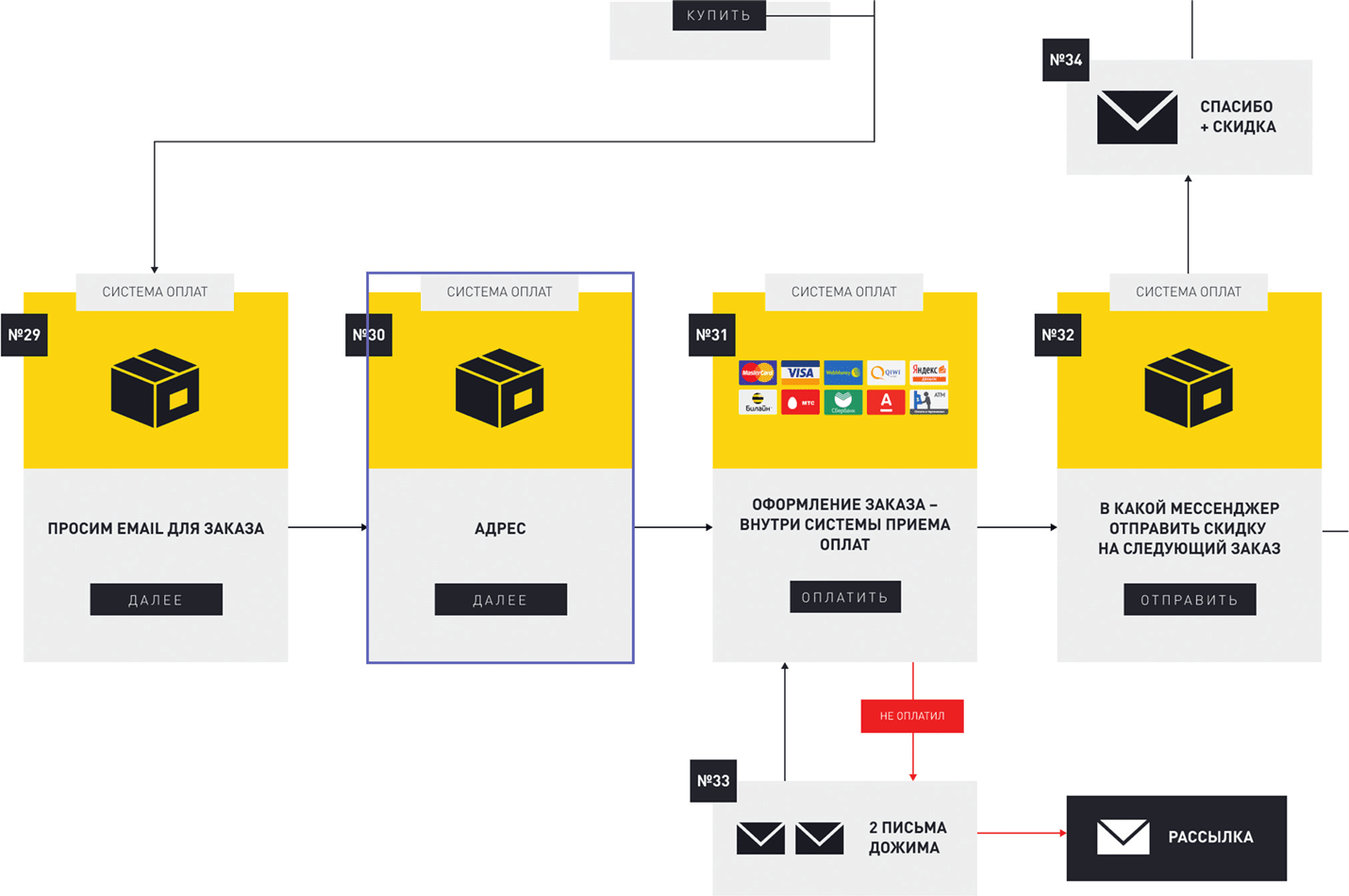 Если на любой из страниц потенциальный клиент нажимает кнопку «Купить», он попадает в блок № 29, где мы предлагаем ему ввести адрес электронной почты. После этого клиент попадает в блок № 30, где оставляет свой адрес для доставки товара. Далее, в блоке № 31, происходит выбор системы оплаты и, собственно, сама оплата.