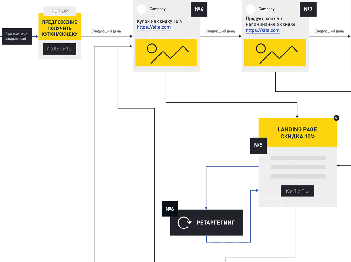 Что происходит, если человек изучил лендинг с товарами для холодного, теплого или горячего трафика, но игнорирует покупку и пытается закрыть страницу? В этом случае на его экране появляется всплывающее окно (Pop-up), где мы говорим, что у него есть купон на скидку, и предлагаем выбрать мессенджер, в котором он сможет его получить. Если это был посетитель лендинга для горячего трафика, вы с помощью ретаргетинга переводите его на получение скидки на какой-то из заинтересовавших его продуктов в мессенджер.