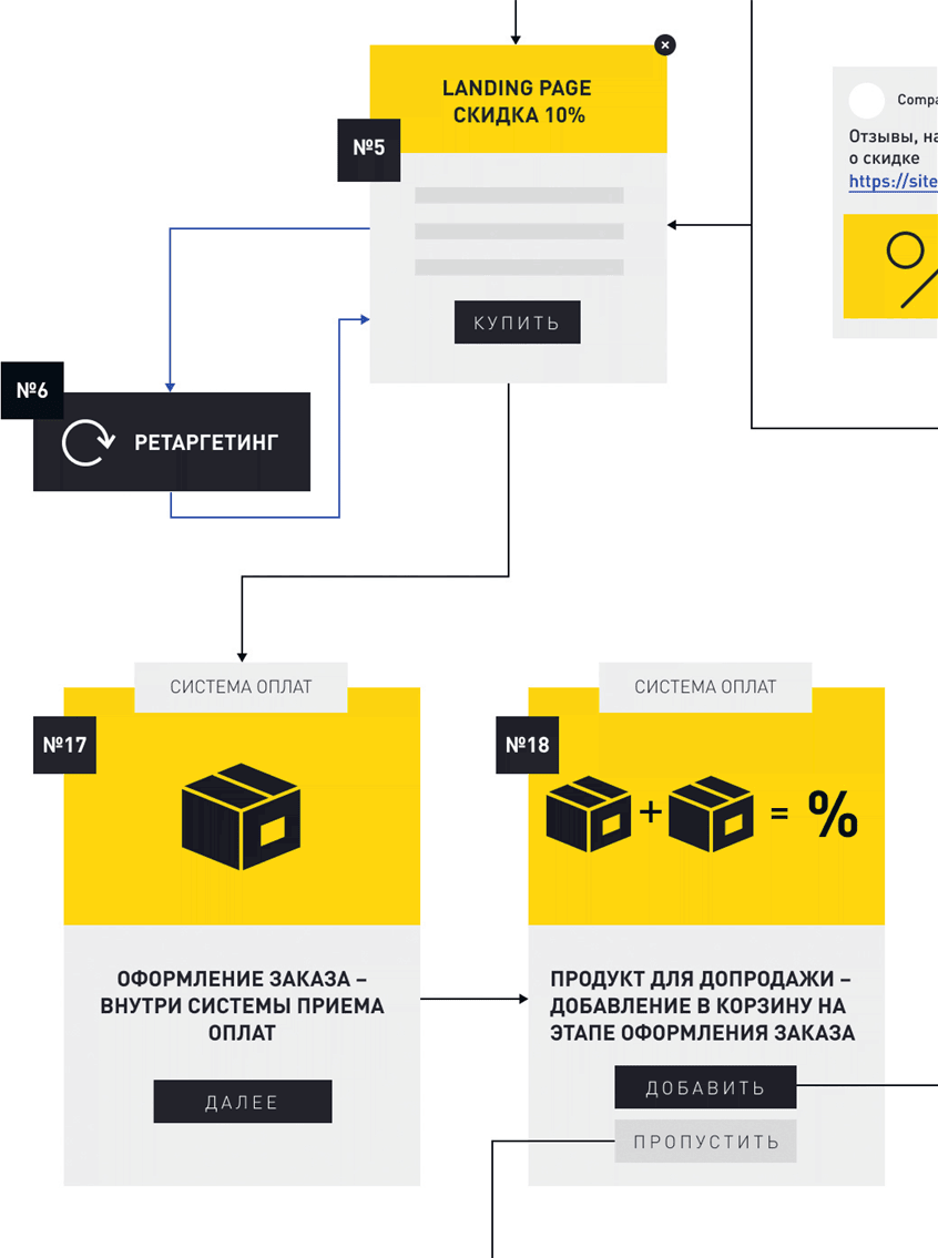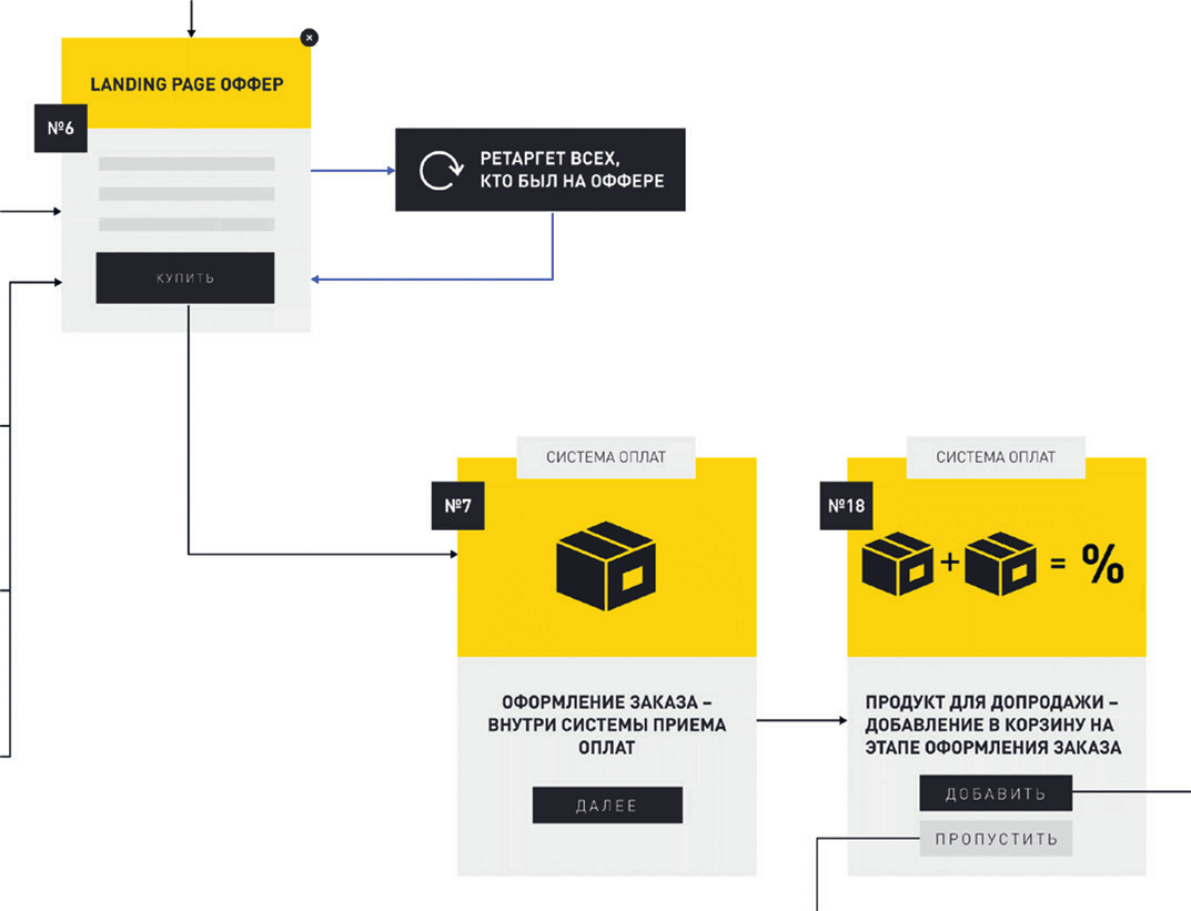 При нажатии на кнопку «Купить» на лендинге № 5 подписчика переадресовывает на страницу оформления заказа № 17, где он вводит свои данные и на странице № 18 получает предложение добавить в корзину продукт для допродажи (Upsell, US) – товар-дополнение к уже выбранному.