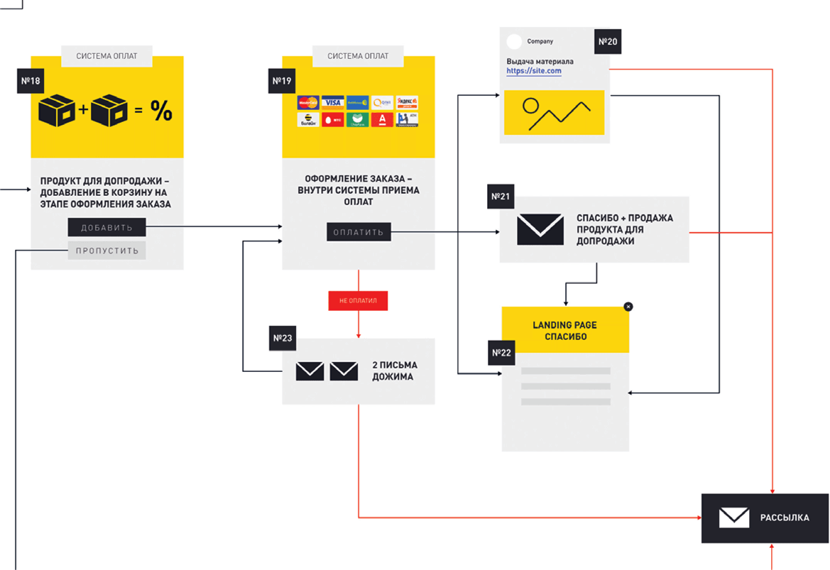 1) добавить US – тогда он попадает в блоки №№ 19–23, где выбирает систему оплаты (№ 19) и проводит деньги либо получает письма дожима на оплату (№ 23) и далее попадает на страницу благодарности за покупку двух товаров (№ 22). Параллельно ему приходит письмо, в котором вы благодарите его за покупку US, сообщаете детали доставки и можете предложить ему еще один продукт для допродажи (№ 21) и сообщение в мессенджере (№ 20), которое дублирует суть письма № 21;