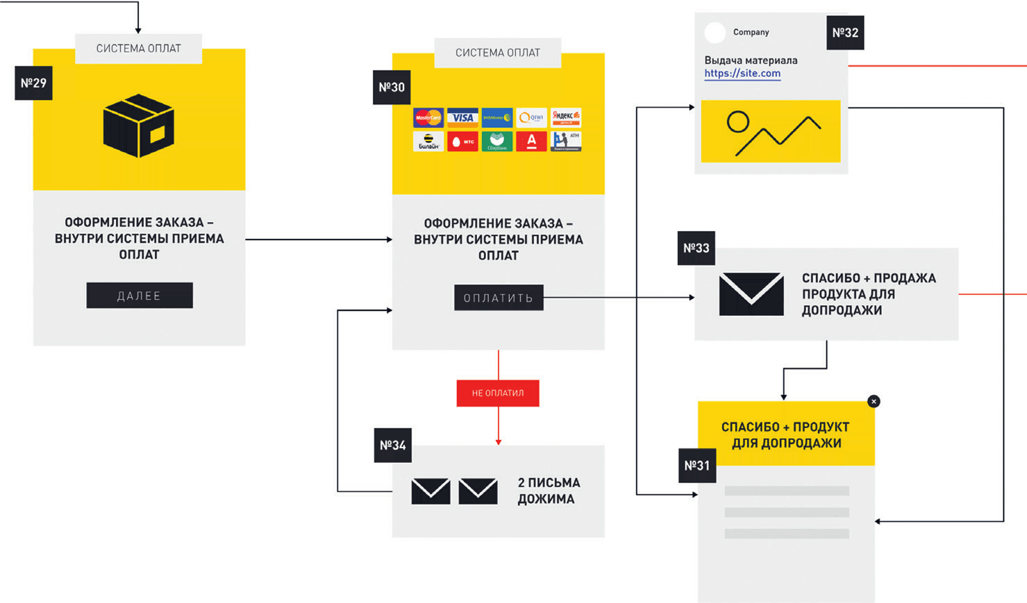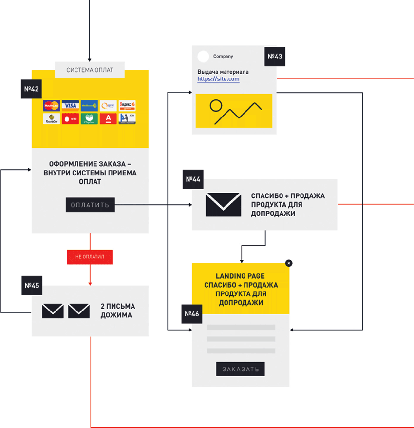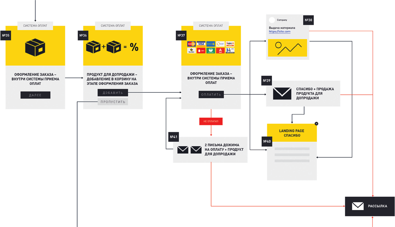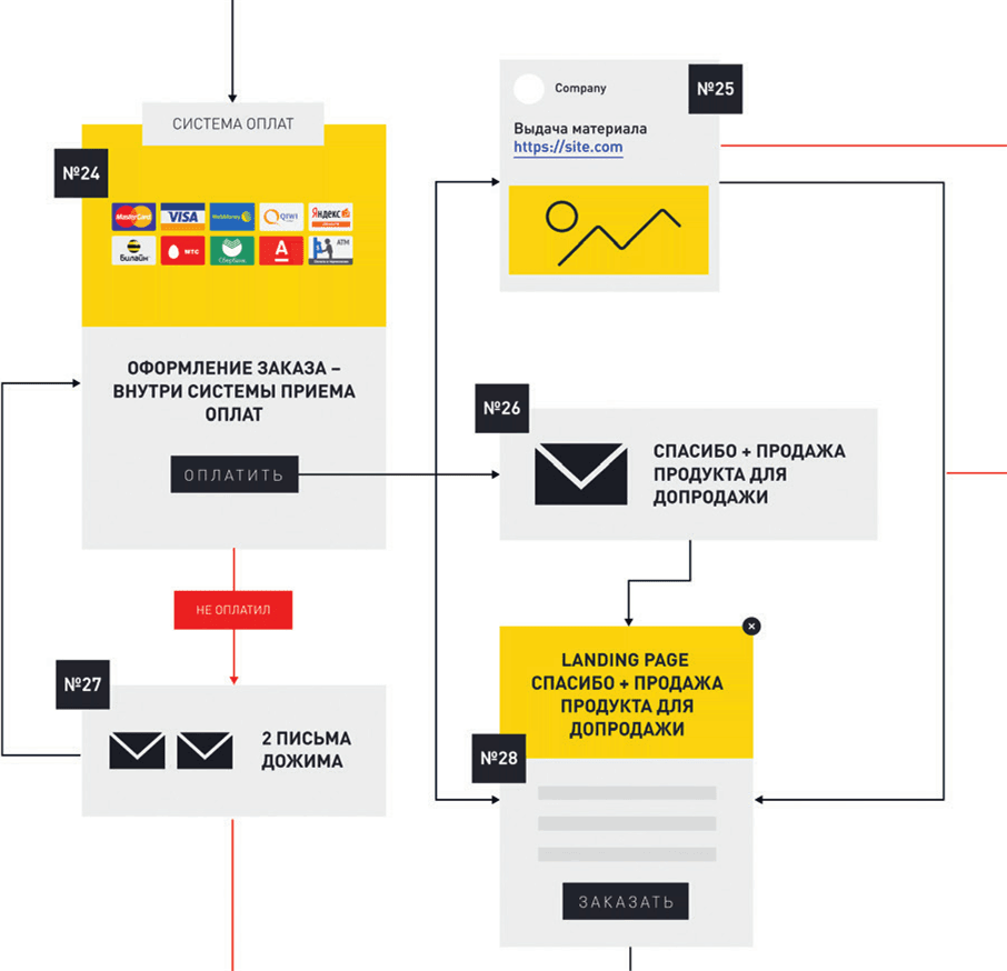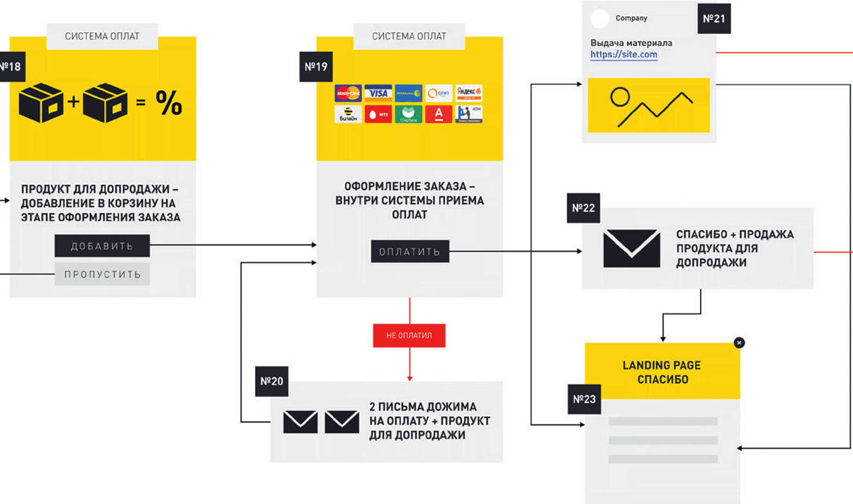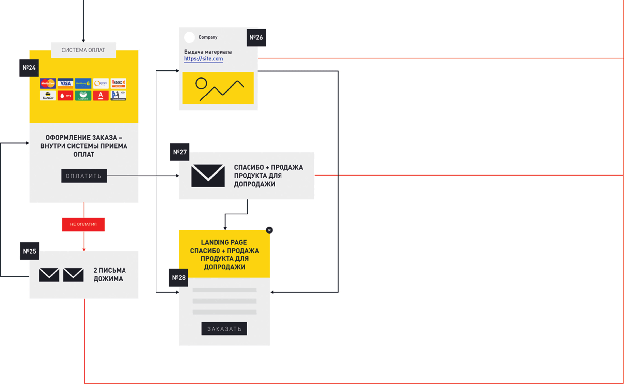 2) отказаться от добавления US (тогда то же самое происходит в блоках №№ 24–28). Разница состоит в том, что в блоке № 28 мы еще раз предлагаем ему приобрести US, уже после оплаты первого продукта, но подаем его под другим углом – если в предыдущем сценарии вы предложили приобрести два товара со скидкой, то сейчас можете оперировать преимуществами US или нарисовать картинку, из которой клиент поймет, чего он лишится, если не купит этот продукт.