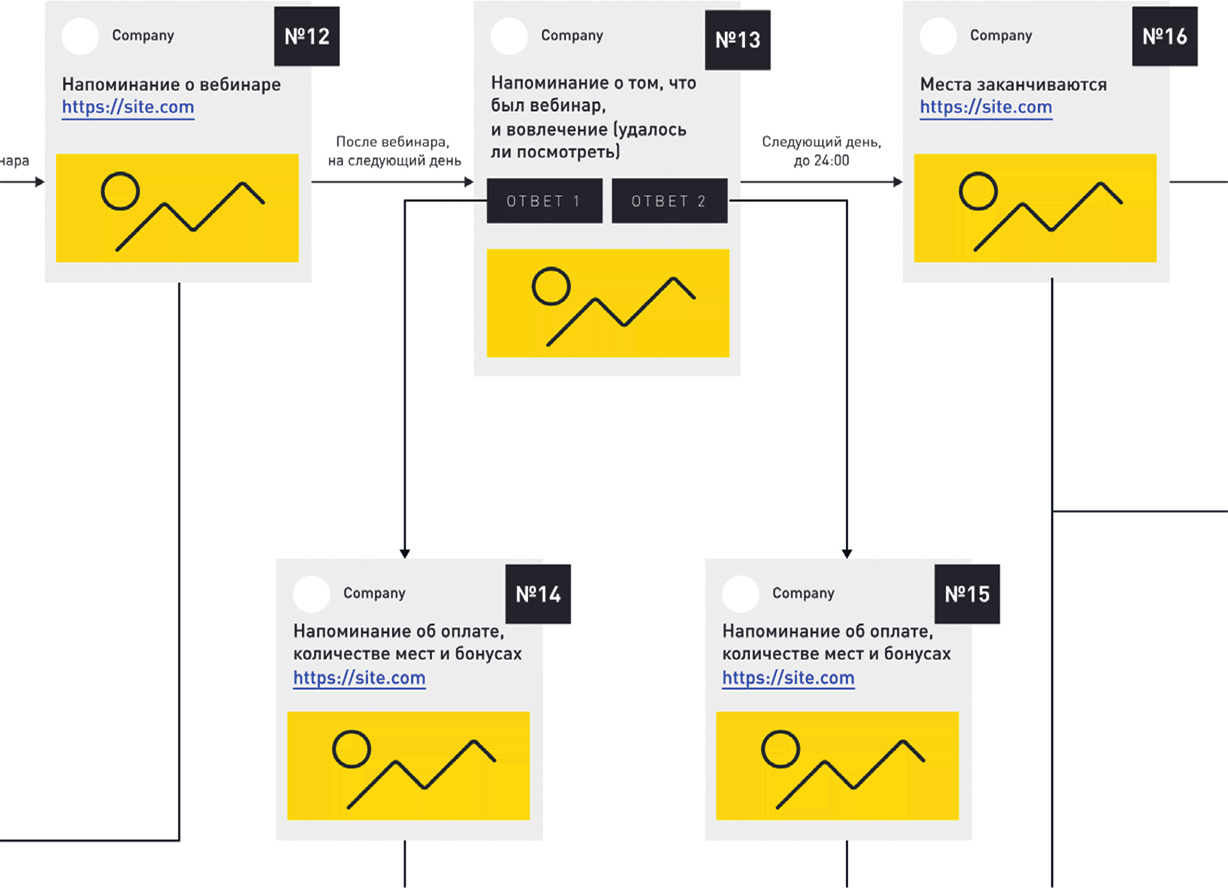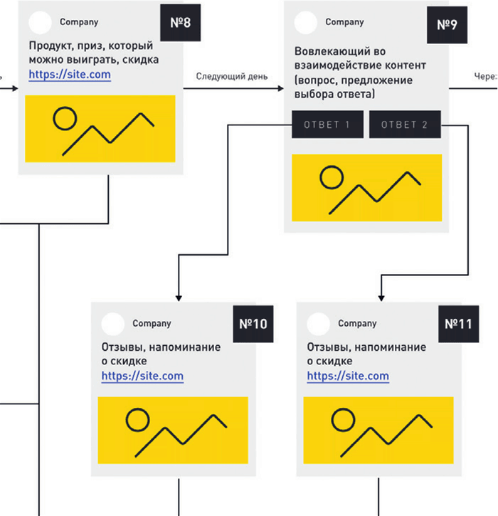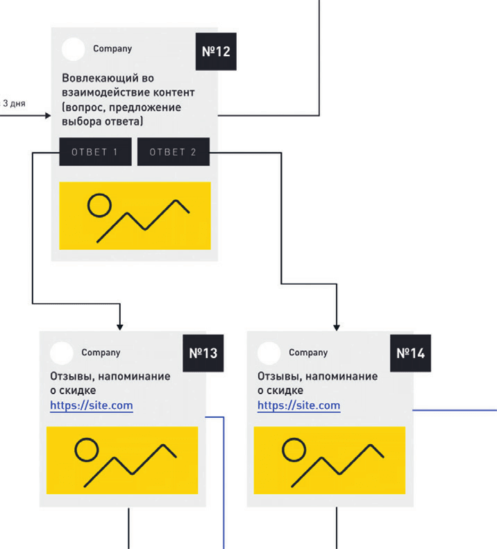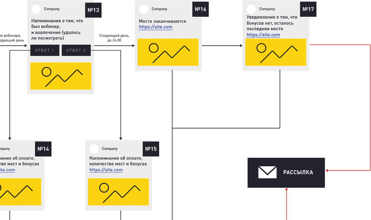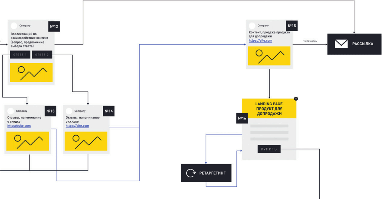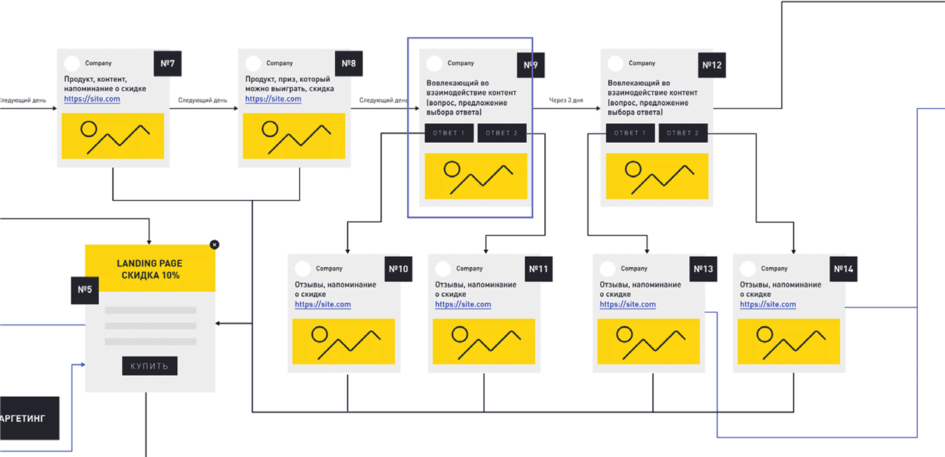 Что происходит, если человек никак не реагирует на вопросы в блоках № 9 и № 12 и на данном этапе покупка не совершена? Тогда подписчик попадает в рассылку, где вы делитесь контентом, рассказываете ему о свойствах продукта, предлагаете участие в акциях или другие товары (но не напрямую, а только после вовлечения через контент), которые смогут его заинтересовать.