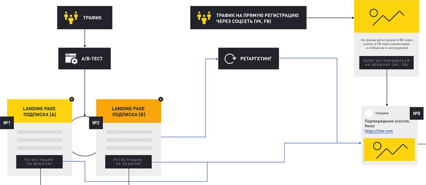 Обычно в этой модели все сводится к классике: создается подписная страница для регистрации на вебинар, регистрация подтверждается через электронную почту, затем проводится вебинар, и на нем участникам делают предложение приобрести платный продукт.