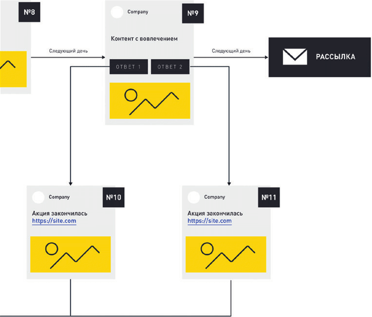 Следующее сообщение № 9 является дожимом, когда вы вовлекаете подписчика в диалог с вами, задаете ему вопрос и, в зависимости от ответа, присылаете сообщение № 10 или № 11, в котором даете контент и «включаете» желание купить через страх окончания акции.