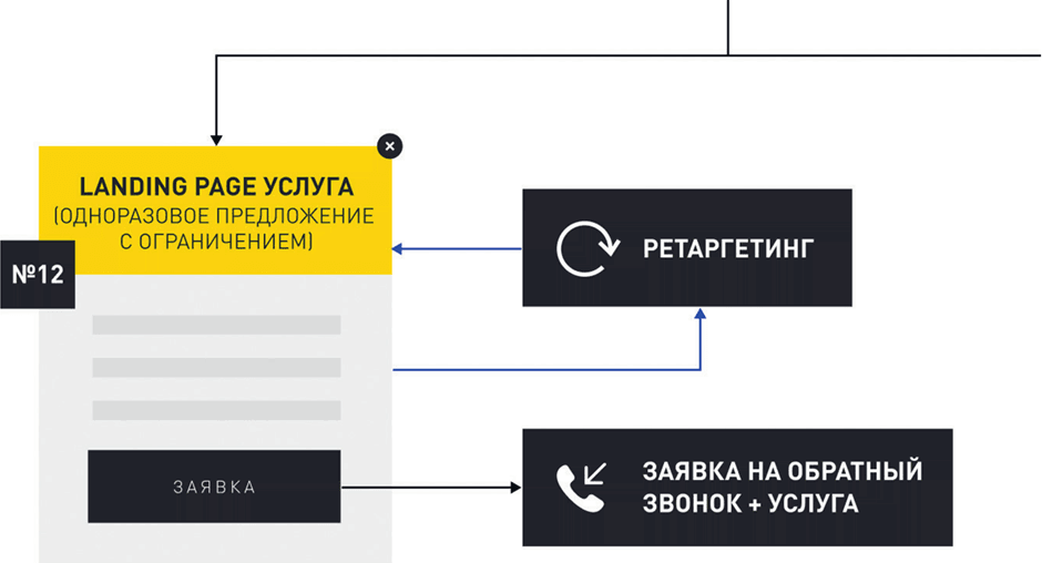 Усилим эту модель с помощью А/В-теста: одна точка входа для горячей аудитории – лендинг № 1 с возможностью заказать услугу, вторая № 2 – для холодного трафика с возможностью больше узнать о компании/эксперте, полистать картинки, подписаться на бесплатный продукт. В обоих случаях у посетителя есть возможность позвонить (или заказать звонок) и оставить заявку.