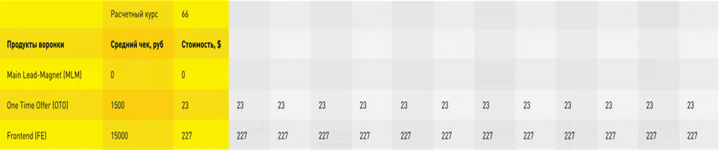 Начнем с того, что внесем платные продукты линейки, которые учтены в вашей автоворонке продаж. В данном случае это одноразовое предложение и передовой продукт. В таблице я указал стоимость в рублях, проставил расчетный курс и перевел стоимость обоих продуктов в доллары США. Стоимость продуктов неизменна, и мы дублируем ее на 12 месяцев. Далее все цифры в таблице я считаю в долларах.