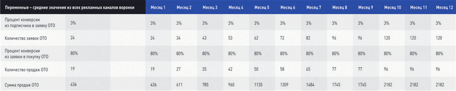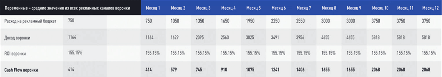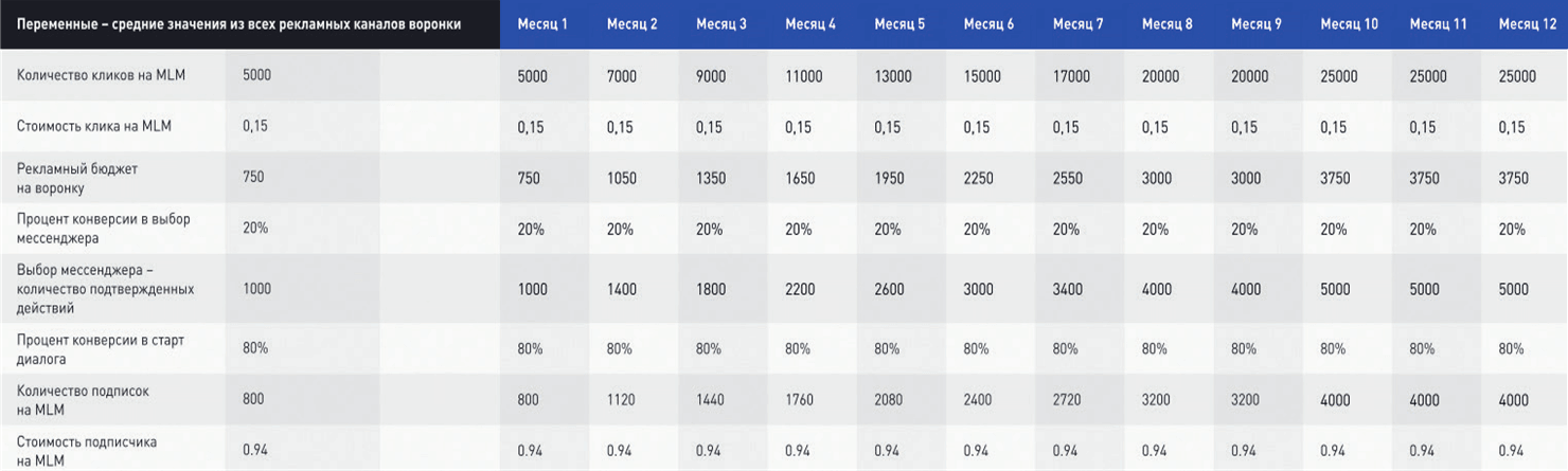 В плане учтено: количество переходов на страницу главного лид-магнита (Main Lead-Magnet, MLM). Также указана итоговая стоимость клика на этой странице. Вместе они дают ежемесячные затраты на рекламу.