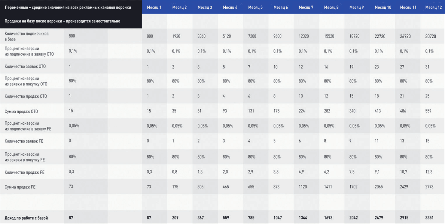 Обратите внимание: 12 месяцев, и с каждым месяцем база растет. Безусловно, будут потери, но 1–2 %, а не 10–20 %, как принято считать. Получается, из месяца в месяц мы наращиваем базу. И это тот актив, который мы можем монетизировать дальше и выжимать одну десятую процента каждый раз из общего количества базы. Это вполне реально, и неважно, 10 тыс. или 100 тыс. человек в ней.