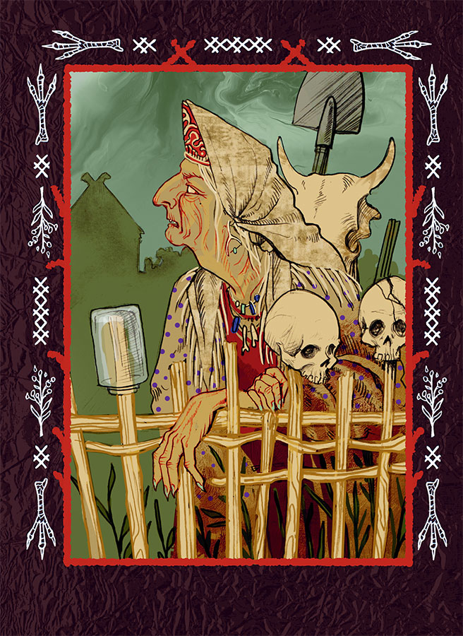 Причем избушку нельзя обойти самому, потому что вокруг нее «тьма кромешная» либо дом плотно обнесен частоколом с насаженными на колья черепами, и приходится просить, чтобы изба развернулась. Местоположение избушки Яги в сказках побудило замечательного советского фольклориста В. Я. Проппа увидеть в этом жилище своего рода сторожевую заставу на рубеже человеческого и нечеловеческого миров: «Эта избушка – сторожевая застава. За черту он (герой. – К. К.) попадет не раньше, чем будет подвергнут допросу и испытанию, может ли он следовать дальше». Сама же Яга оказывается сторожем или хранителем границы между мирами.