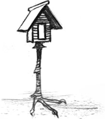 Курьи ножки избушки Яги – по всей видимости, вовсе не птичьи лапы, а курные столбы, то есть окуренные дымом подпорки, на которые ставились в старину славянские «избы смерти», срубы с прахом покойника внутри. Если Яга – страж дороги в потусторонний мир, на «тот свет», то ее избушка должна обладать соответствующими внешними характеристиками, понятными герою сказки, и курьи ножки как раз и играют роль такого указателя. Позднее, в конце XIX и в XX столетии, выражение «курьи ножки» стали толковать буквально, благодаря чему на картинах, книжных иллюстрациях и в игровом и анимационном кино избушка Яги получила птичьи лапы.