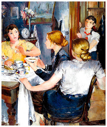 «Дворцовая» культура социалистического реализма во многом формировалась как ответ на общественный запрос, откуда и происходит ее популистский характер: если в прошлом дворцы принадлежали аристократам и буржуазии, то теперь каждый имел возможность хотя бы раз в жизни пожить во дворце – например, в санатории на южном курорте. Детям же отдали в распоряжение дворцы пионеров и школьников. Под впечатлением от поездки в Свердловск (Екатеринбург) Юрий Пименов создал триптих «Работницы Уралмаша» (1934, ЕМИИ), в котором одна и та же девушка представлена в разных житейских ситуациях: в заводском цеху за станком, в театральной ложе и в общежитии, где она протягивает блюдце с чаем своей подруге, но та отказывается, потому что не желает чаевничать по мещанскому обычаю. Каждая из сценок в триптихе разыграна изящно, и даже цех не вызывает ассоциаций с тяжелым физическим трудом и выглядит как место для размышления и созерцания.