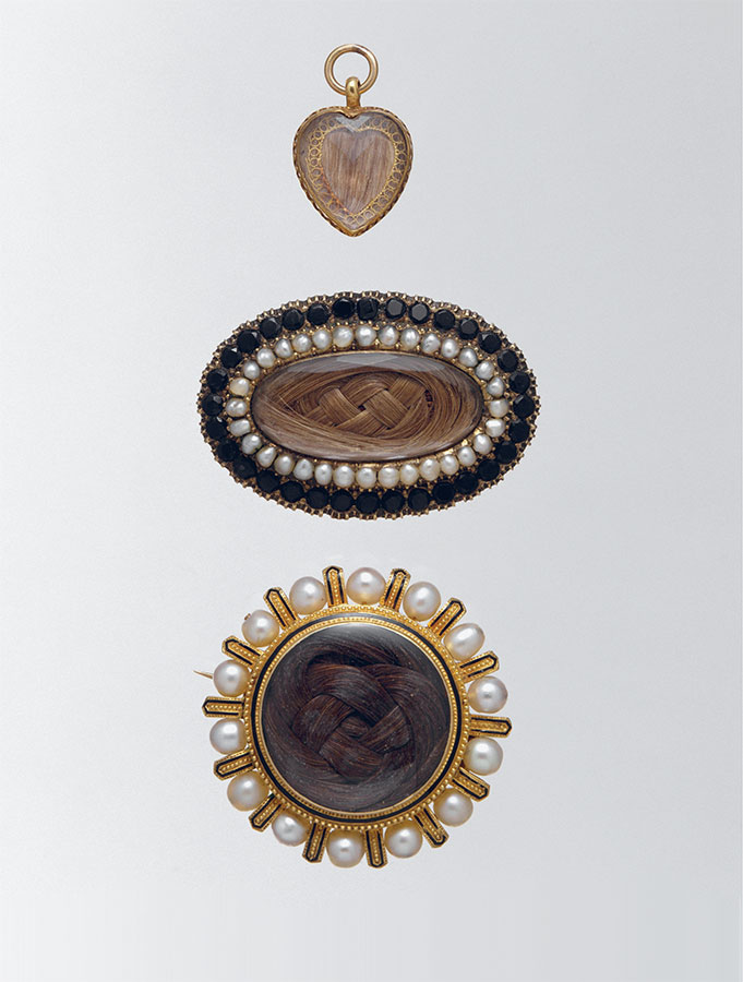 В викторианских траурных украшениях часто сочетались черные камни и пряди волос умершего.