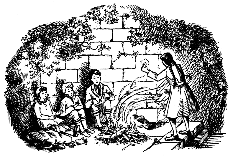 Потом девочки пошли ещё за яблоками, а мальчики развели костёр на возвышении, ближе к углу, где, как они решили, будет самое уютное и тёплое место. Они изрядно помучились и извели много спичек, но в конце концов хворост запылал и все четверо уселись спиной к стене и лицом к огню. Они попытались испечь яблоки на прутиках, но печёные яблоки без сахара не так хороши и к тому же обжигают руки, а если их остудить, то становятся совсем невкусными. Пришлось довольствоваться сырыми яблоками, которые, как заметил Эдмунд, заставляют осознать, что школьные завтраки были не так уж плохи: