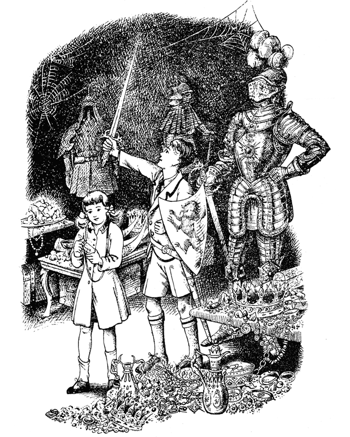 Теперь ни у кого не оставалось сомнений, что это старинная сокровищница в Кэр-Паравале, где они некогда правили. Посередине шло что-то вроде дорожки (как в оранжерее), по обе стороны на равных расстояниях стояли роскошные доспехи, словно рыцари, охраняющие сокровища. Между ними помещались полки, заваленные редкостными вещами: ожерельями, браслетами и кольцами, золотыми чашами и блюдами, длинными рогами из слоновой кости, застёжками, цепями и диадемами из золота, множеством неоправленных камней, насыпанных как картошка, – алмазов, рубинов, яхонтов, изумрудов, топазов и аметистов. Под полками стояли окованные скрепами и запертые на тяжёлые замки большие железные сундуки. Здесь было ужасно холодно и так тихо, что каждый слышал дыхание стоящего рядом. Сокровища покрывал толстый слой пыли: если бы ребята не знали, где что находится, и не вспомнили большинство вещей, то с трудом угадали бы, что это за драгоценности. Было в этом месте что-то печальное и немного страшное из-за того, наверное, что оно выглядело таким заброшенным. Вот почему первые минуты все стояли в молчании.
