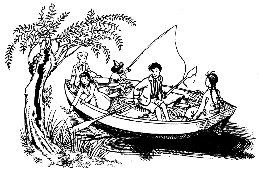 Четверо детей и гном подошли к краю воды, не без труда оттолкнули лодку и вскарабкались в неё. Гном сразу же взял на себя управление. Вёсла, конечно, были слишком для него велики, так что грёб Питер, а гном направлял их на север, вдоль пролива, и дальше на восток, вдоль оконечности острова. Теперь ребята видели реку, все заливы и выступы берега вдали. Некоторые казались знакомыми, но леса, которые разрослись за прошедшие годы, очень все изменили.