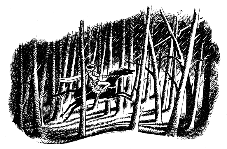 Сверкнула молния, и гром расколол небо прямо над головой. Ретивый закусил удила и понёс. Каспиан был хороший наездник, но и у него не хватило сил остановить коня. Он держался в седле, но знал, что в этой дикой скачке жизнь его висит на волоске. Дерево за деревом возникало перед ними из мрака, конь и всадник едва успевали увернуться. Затем, так внезапно, что, казалось, нельзя было и почувствовать боль (однако он всё же почувствовал), что-то ударило Каспиана в лоб, и больше он ничего не помнил.