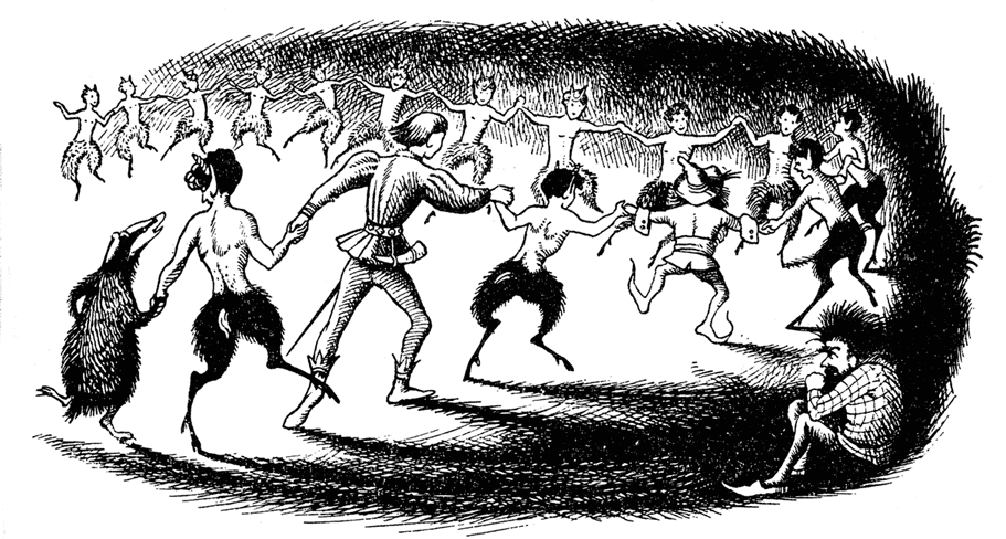 Барсук только хрюкнул. Наступило такое долгое молчание, что Каспиан почти погрузился в сон, когда ему показалось, что из леса за его спиной доносится тихая музыка. Потом он подумал, что это ему снится, и прилёг опять, но едва коснулся ухом земли, как услышал (или почувствовал – трудно сказать) лёгкие удары или барабанную дробь и поднял голову. Звуки ударов стали тише, но возвращалась музыка и теперь звучала куда яснее. Похоже было на флейты. В свете луны – Каспиан проспал больше, чем думал, – он увидел Боровика, почему-то сидевшего неподвижно и не сводившего глаз с леса. Музыка, какая-то странная, завораживающая, слышалась всё ближе и ближе, как и топот множества ног, пока наконец из лесной чащи на лунный свет не выбежали танцующие тени, точно такие, о каких Каспиан грезил всю жизнь. Они были не намного больше гномов, но гораздо тоньше и грациознее. Их кудрявые головки украшали маленькие рожки, верхняя часть тела поблёскивала, а бёдра и ноги были как у козлов.