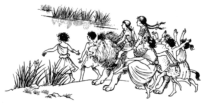 Вся компания двинулась – Аслан возглавлял, Вакх и его менады носились, метались, кувыркались, зверюшки рыскали вокруг, а силен на своем ослике замыкал шествие.