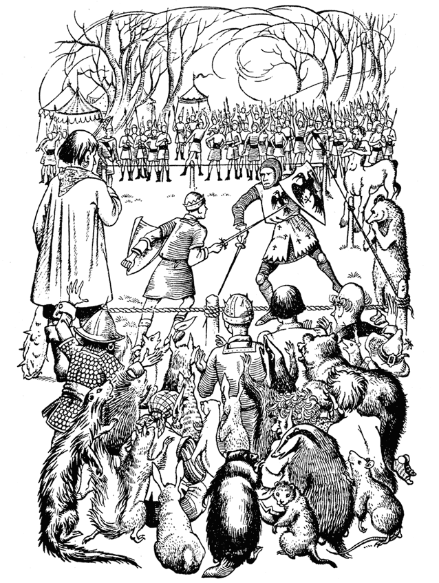 Страшная суматоха поднялась на Аслановом холме, когда эта новость распространилась среди сподвижников Каспиана. Эдмунд с одним из советников Мираза размечал место для поединка, обозначая его кольями и верёвками. Два тельмарина уже стояли по углам, а третий – посередине одной из сторон, как маршалы турнира. Три других маршала должны были представлять Верховного короля. Питер как раз объяснял Каспиану, что тот не может быть одним из них, поскольку его право на престол и стало предметом спора, когда густой, сонный голос произнёс: