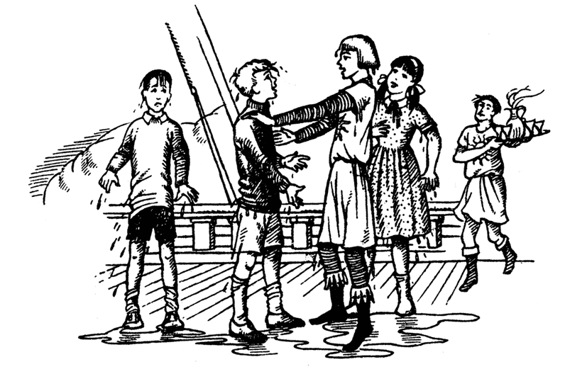 Люси и Эдмунд привыкли к приключениям, но и они могли только, как Юстас, воскликнуть «о-о!», потому что из рамы на них выплеснулась большая холодная солёная волна и окатила с головы до ног.