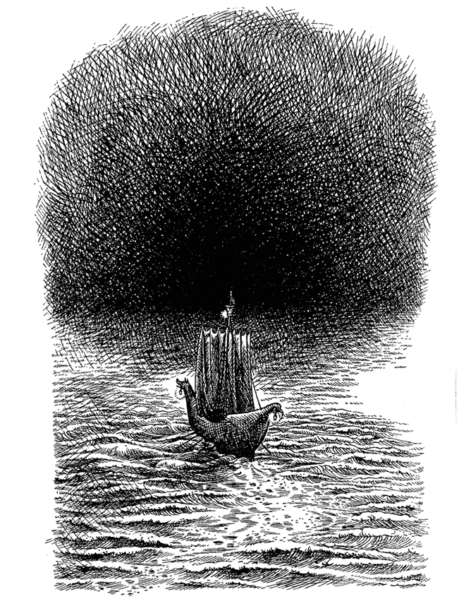 С полминуты стояла тишина, а потом, бряцая оружием, вся команда бросилась к главному люку, заняла свои места у вёсел и принялась грести изо всех сил. Дриниан поворачивал румпель, а боцман отдавал команды со скоростью, какой не видывали на море, потому что в эти полминуты каждый припомнил какой-то свой сон – сон, из-за которого потом боишься лечь спать, – и понял, что значит причалить к земле, где сны сбываются.