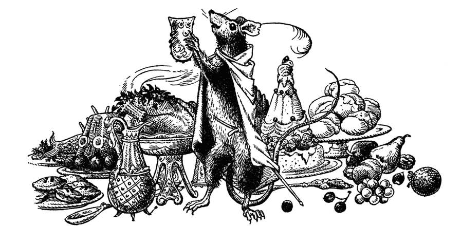 Рипичип кинулся вперёд, вскочил на стул, а оттуда на стол, пробежал по нему, ловко, словно танцор, минуя кубки, украшенные драгоценными камнями, пирамиды фруктов и солонки слоновой кости, и остановился напротив таинственных серых куч. Внимательно их осмотрев и даже потрогав, вояка крикнул: