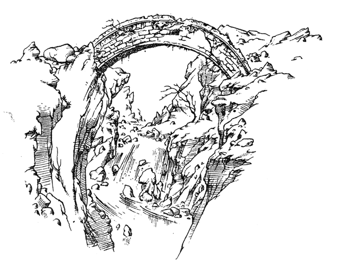 Разом повернув головы, они увидели то, что ожидали увидеть меньше всего, – мост. Да ещё какой! Это было грандиозное сооружение в виде арки, перекинутой через ущелье с одной скалы на другую, причём вершина этой арки возвышалась над верхушками скал, словно собор Святого Павла над прочими городскими постройками.
