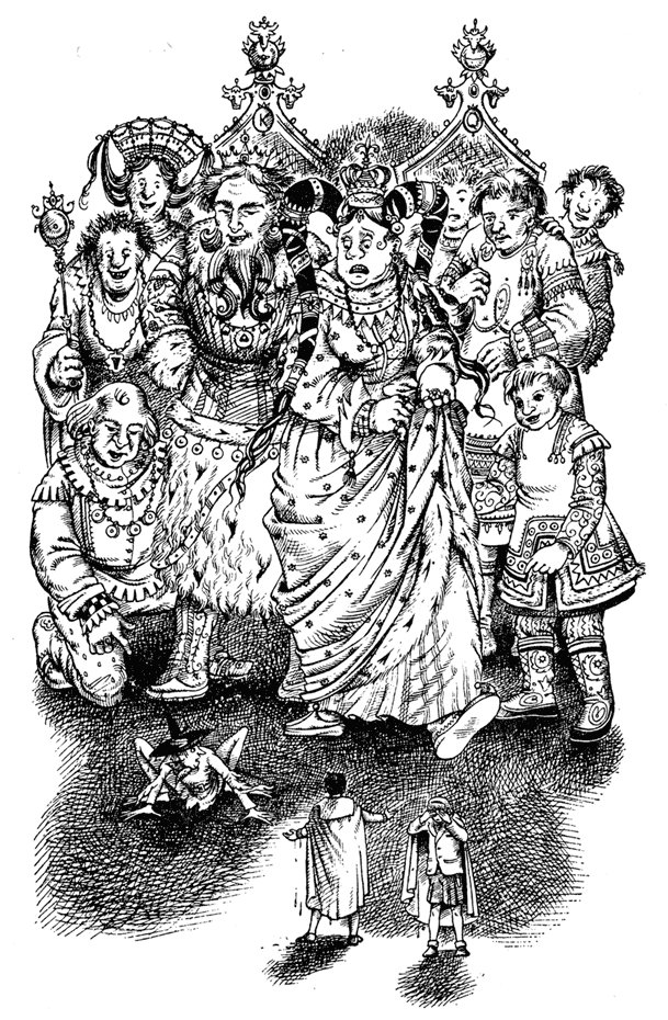 Юный великан схватил его за пояс и жестом приказал детям следовать за ним. В таком не слишком достойном виде они прошли через внутренний двор. Хмур, зажатый в кулаке великана, брыкался в воздухе и действительно очень походил на лягушку, но дети этого почти не замечали, поскольку вскоре оказались перед огромной дверью главного замка. Почти бегом, чтобы успеть за великаном, они миновали несколько коридоров, а затем вошли, щурясь от яркого света, в огромный зал, где горели лампы, пылал огонь в очаге, и всё это отражалось в позолоченном потолке и карнизах. Множество великанов в роскошных одеждах стояли вдоль стен справа и слева, а в дальнем конце зала на двух тронах сидели две огромные фигуры – король и королева.