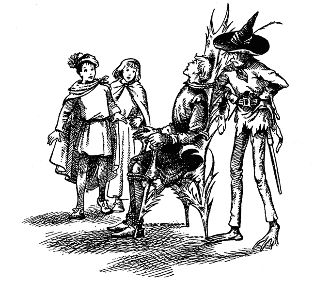 Покачав головой, Муллугут сделал знак путешественникам следовать за ним и начал взбираться по винтовой лестнице. С каждым шагом становилось светлее. Стены украшали роскошные гобелены. Наверху через тонкие занавески лился золотистый свет лампы. Лакеи раздвинули занавески и остались стоять по бокам, а трое друзей вошли в комнату. Она оказалась великолепной: с украшенными гобеленами стенами, ярким пламенем в чистом очаге, красным вином в сверкающих хрустальных стаканах на столе. Им навстречу поднялся светловолосый молодой человек. Он был красив и выглядел одновременно дерзким и добрым, но в лице его проглядывало что-то странное. Одетый в чёрное, он слегка походил на принца Гамлета.