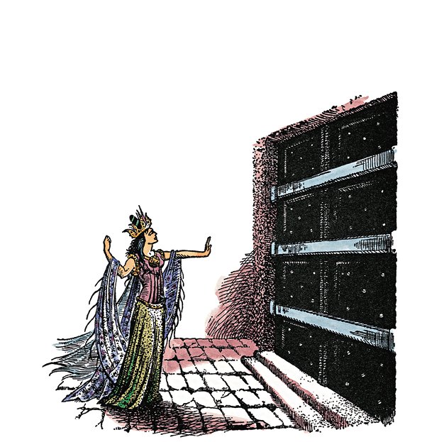 Всё было так тоскливо и так одинаково, что Дигори собрался было надеть жёлтое кольцо и вернуться в уютный, зелёный, живой лес, когда перед ними предстали две высокие и, похоже, золотые двери. Одна была приоткрыта. Конечно, дети заглянули в неё и замерли, разинув рты. Наконец они увидели то, что увидеть стоит.