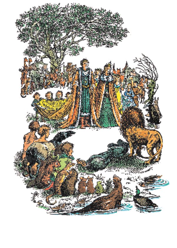 Когда их охладили в реке, король и королева опустились на колени перед львом, и он короновал их, а потом сказал: