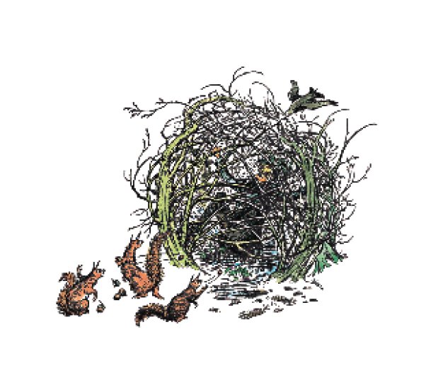 И Дигори увидел клубок или клетку, точнее – большой, как клетка, клубок переплетённых ветвей. Два слона пустили в дело хоботы, три гнома – топорики, быстро всё расчистили, и зрителям явилось золотое деревце, серебряное и ещё какое-то, непонятное, но очень грязное.