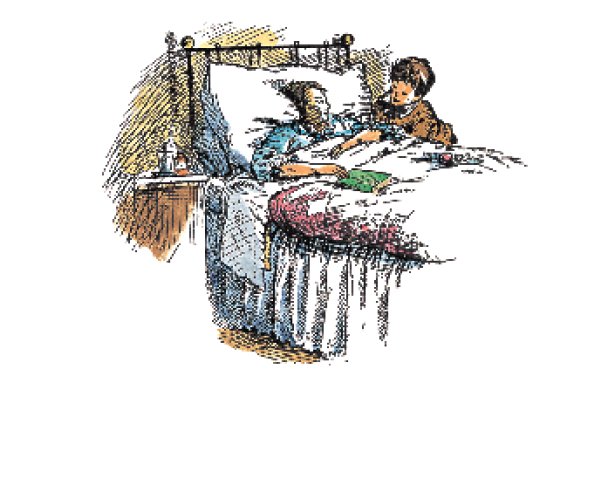 Дигори перевёл дух и тихо вошёл в мамину спальню. Среди подушек, как и много раз прежде, белело её исхудавшее лицо, от одного взгляда на которое вы бы заплакали. Дигори вынул из кармана яблоко жизни.