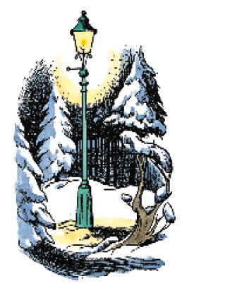 – Кажется, это ветки деревьев! – воскликнула Люси. Впереди она заметила какой-то свет, но не рядом, где должна быть задняя стенка шкафа, а довольно далеко. На неё падало что-то холодное и мягкое. И вдруг она поняла, что стоит одна на снегу посреди леса, что сейчас ночь, а в воздухе кружатся снежинки.