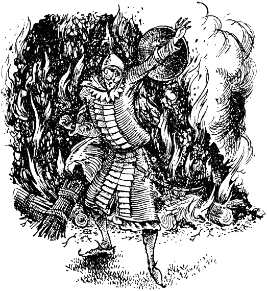 В следующую минуту перед изумлёнными нарнийцами выступили из-за хлева семь фигур, четверо из них – в сияющих кольчугах. Меч короля блеснул в свете костра. Он взмахнул им над головой и громко воскликнул: