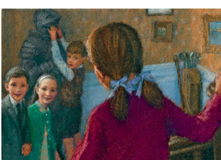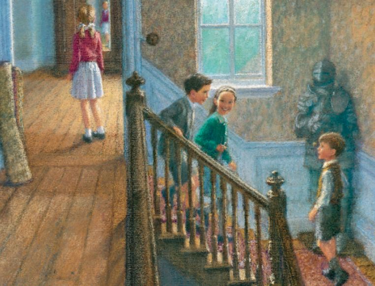 Дом, в который они попали, казалось, не имел конца и был полон самых удивительных мест. Несколько дверей, которые они открыли первыми, как и ожидалось, вели в пустые спальни. Но вскоре они попали в очень длинную комнату, полную картин. Там же ребята обнаружили рыцарские доспехи. За ней следовала комната, задрапированная зелёной тканью, со стоящей в углу арфой. Затем шли три ступени вниз и пять – наверх, в небольшую галерею с дверью на балкон. Дальше шла анфилада комнат, переходящих одна в другую и уставленных рядами книг, преимущественно очень старых, некоторые из которых были даже больше церковной Библии в церкви. Вскоре они добрались до комнаты, в которой стоял один платяной шкаф – такой, в дверце которого обычно располагалось зеркало. В комнате больше не было ничего, лишь на подоконнике валялась дохлая муха.