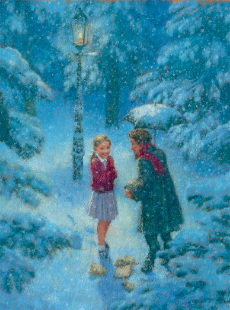 – Кажется, это ветки деревьев! – воскликнула Люси. Впереди она заметила какой-то свет, но не рядом, где должна быть задняя стенка шкафа, а довольно далеко. На неё падало что-то холодное и мягкое. И вдруг она поняла, что стоит одна на снегу посреди леса, что сейчас ночь, а в воздухе кружатся снежинки.