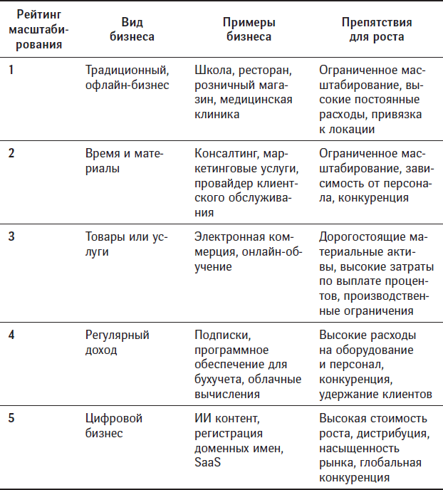 Если вы начинаете с чистого листа, то вам совершенно необходимо проанализировать масштабируемость своих идей, исходя из того, что вам комфортно. Лично я использую шкалу от 1 до 5, где 1 означает наименее масштабируемый бизнес, а 5 – наиболее масштабируемый.