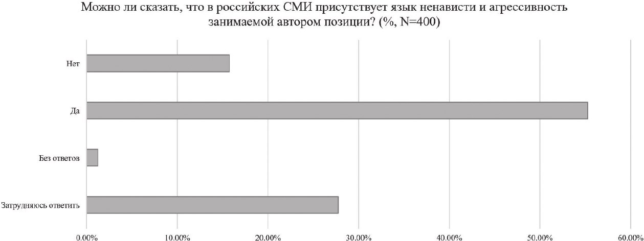 Оценивая общую коммуникативную агрессивность большинство респондентов отметили, что обычно «в российских СМИ присутствует язык ненависти и агрессивность занимаемой автором позиции». С этим согласились 55,25% студентов, не согласилось – 15,75%, остальные затруднились с ответом (см. Рис. 1). Различия между политологами и журналистами в этом вопросе оказались минимальными: разница составила всего 4,5%.