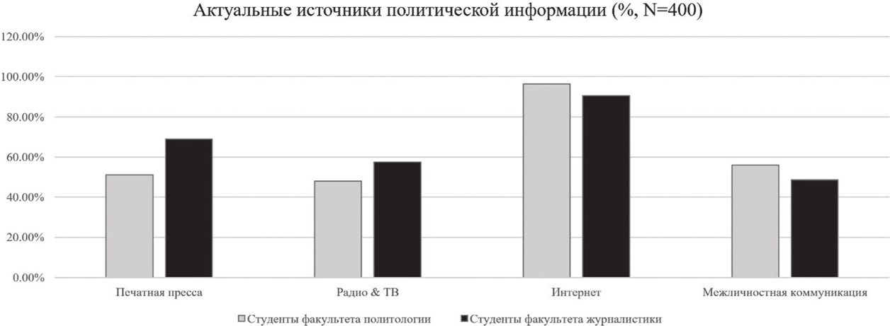 В результате ответов на вопрос об актуальных источниках информации получился рейтинг из четырёх позиций. Разница между ответами студентов обоих факультетов незначительна (см. Рис. 2). Рейтинг студентов направления «Журналистика» следующий: Интернет (90,50%), печатная пресса (69%), радио и телевидение (57,50%), межличностная коммуникация (48,50%). Студенты направления «Политология» показали иной порядок, впрочем, не радикально отличающийся от рейтинга своих коллег: Интернет (96,50%), межличностная коммуникация (56%), печатная пресса (51%), радио и телевидение (48%).