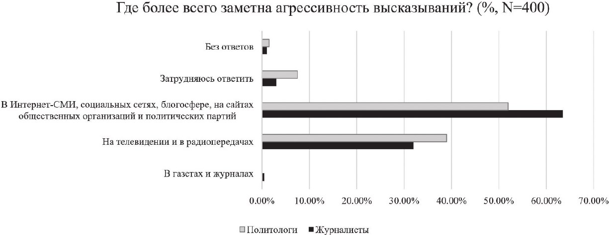 Интересно, что наиболее высокий уровень агрессии участники опроса отметили в Интернете, а наименьшей – в печатной прессе (см. Рис. 4).