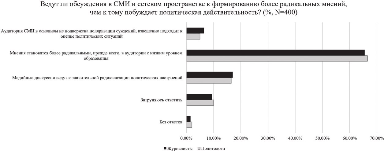Наибольшее количество респондентов считает (66,50% студентов-журналистов и 65,50% студентов-политологов), что «мнения становятся более радикальными, прежде всего, в аудитории с низким уровнем образования» (см. Рис. 5).