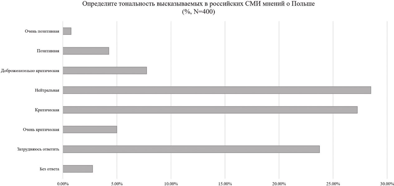 Наибольшее количество респондентов оценивают тональность высказываний СМИ о Польше как «нейтральную» – 28,50%, либо «критическую» – 27,25% (см. Рис. 6).