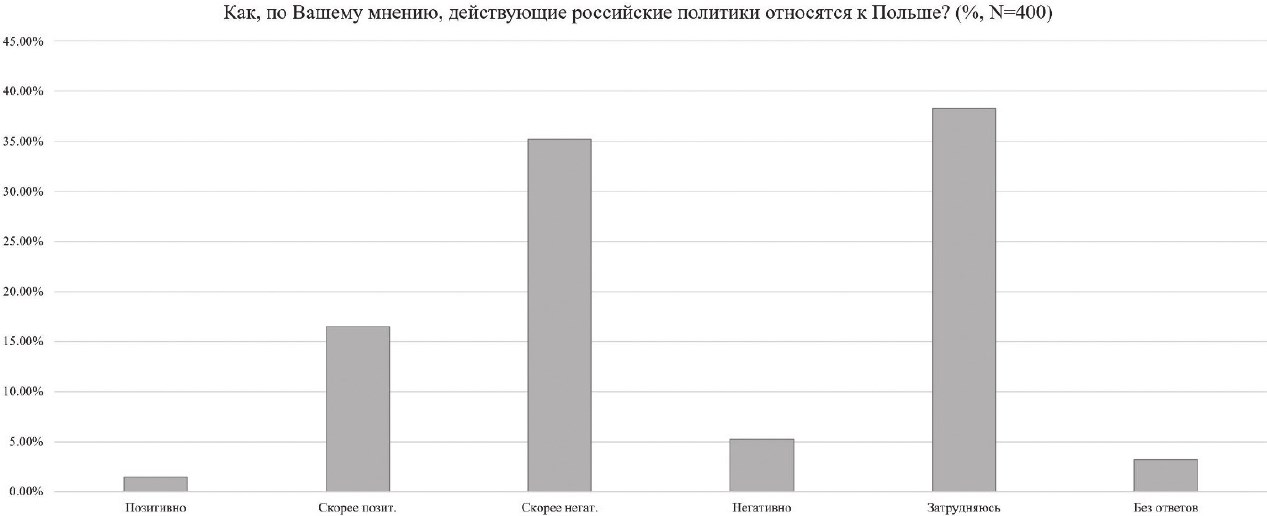 При этом 35,25% опрошенных считают, что действующие российские политики относятся к Польше «скорее негативно», и лишь 5,25% полагают, что отношение «негативно» (см. Рис. 7).