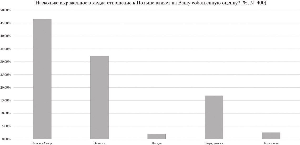 Вопрос, открывающий вторую часть, требовал от респондентов фоновых знаний, являясь единственным открытым вопросом без вариантов ответа, в отличии от остальных: «Как, по Вашему мнению, действующие российские политики относятся к Польше», «Определите тональность высказываемых в российских СМИ мнений о Польше», «Насколько выраженное в медиа отношение к Польше влияет на Вашу собственную оценку», «Как Вы считаете, насколько выраженное в медиа суждение о Польше влияет на позицию аудитории российских СМИ».