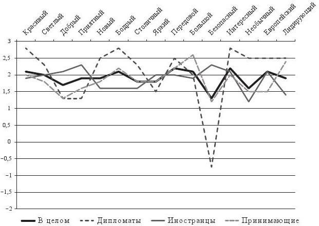 Екатеринбург воспринимается достаточно позитивно всеми целевыми аудиториями. Средняя оценка различных эмоциональных составляющих равняется +2 балла, то есть высоко, положительно оценивается большинство элементов, формирующих эмоциональный образ города (рис. 3).