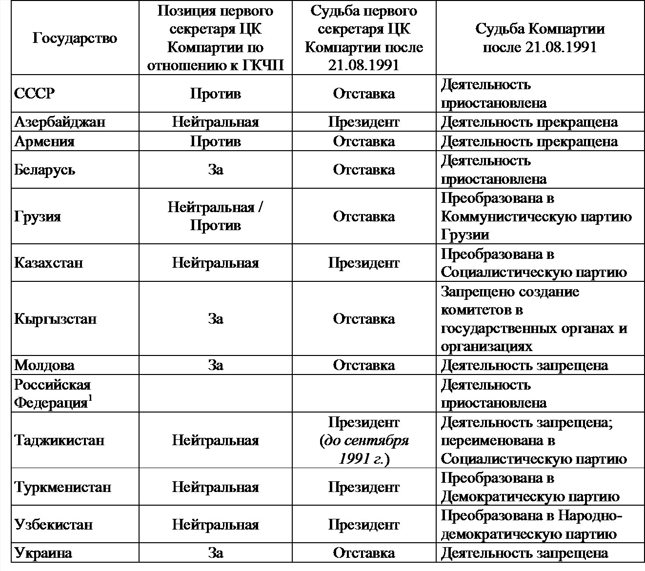 По отношению к ГКЧП большинство республиканских элит в ситуации неполноты информации и неизвестности исхода конфликта заняли выжидательную позицию (см. табл. 3). Из глав республик только А. Акаев, Б. Ельцин и Л. Тер-Петросян открыто выступили против ГКЧП. Однозначная поддержка ГКЧП руководством Компартий Украины и Киргизии привела к потере субъектности их лидеров и их устранению из политического процесса.
